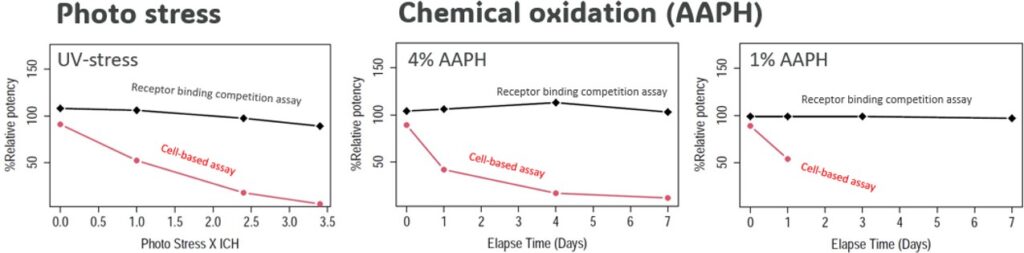 The oxidative stress studies revealed substantial response discrepancies between the two methods (see Fig. 4). The CBA demonstrated higher sensitivity to this type of stress than the Receptor Protein Competition Assay. The impact on the CBA’s % relative potency (%RP) was seen from the very first stress timepoint while the non-cell-based assay generated a flat trend under chemical oxidation. However, the Receptor Protein Competition Assay showed a shallow downward trend under photo stress but substantially different from the CBA one, which %RP value at 1X ICH was already close to falling outside of the qualified assay range (50% – 150%).