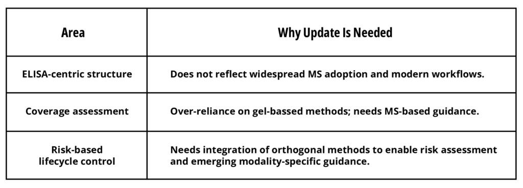 A key component of this year’s discussion will also include a critical reflection on USP 1132, exploring areas where modern practice on new modality development and product quality control may suggest opportunities for refinement and future updates. Example areas are listed in the following table.